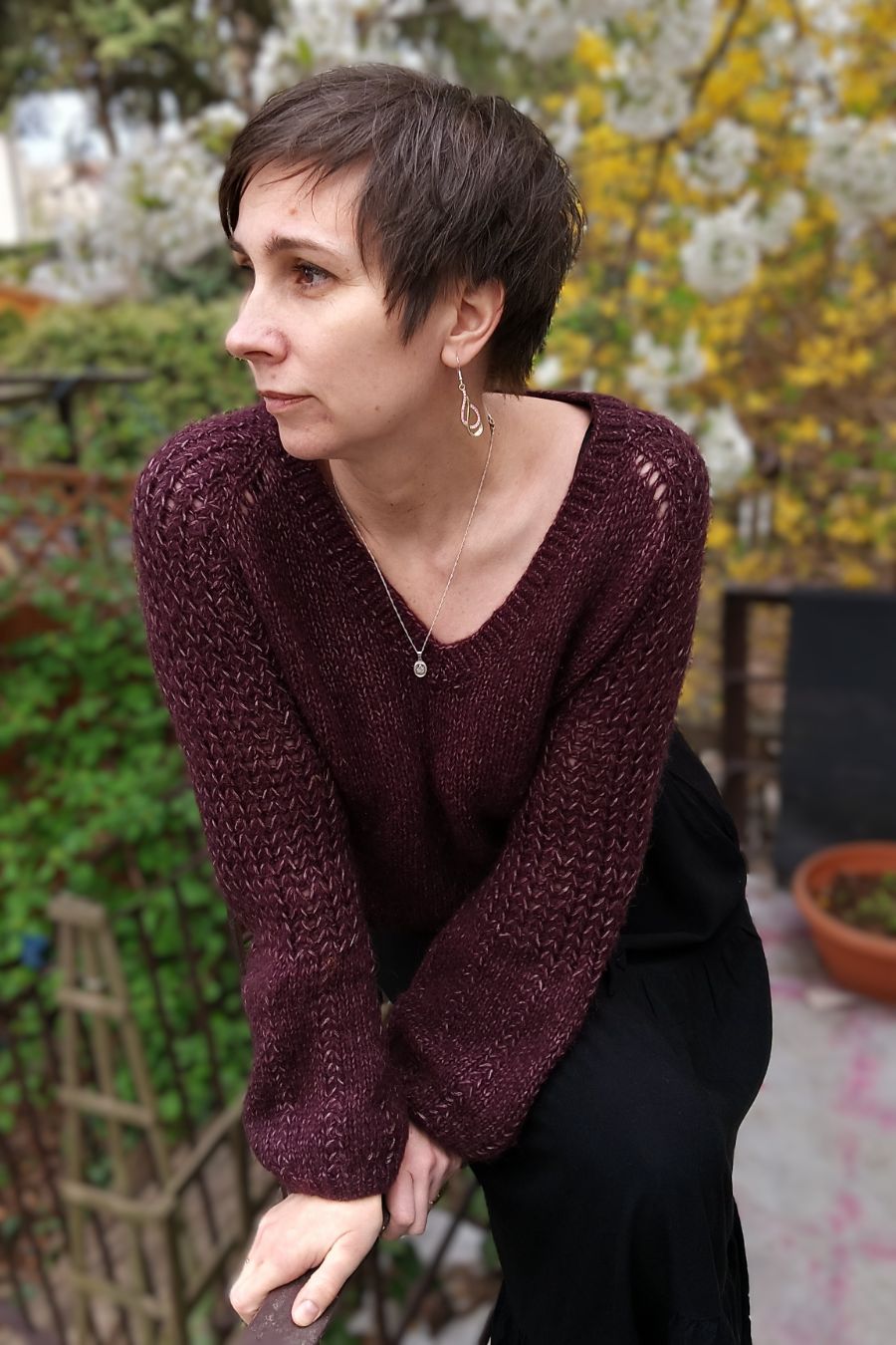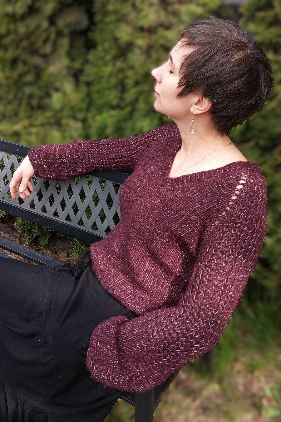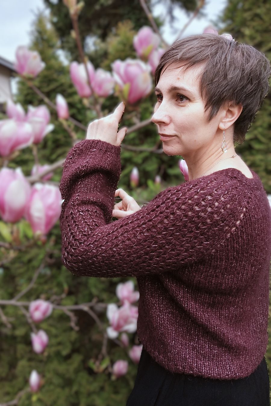Spring Fog jest dziergany od góry, najpierw w rzędach przerabiając reglan, rzędy skrócone na rękawach oraz dodając oczka na dekolt V, a w dalszym etapie w okrążeniu. Rękawy są wypełnione ciekawym ściegiem ażurowym, który przyciąga wzrok. Dolna część rękawa w projekcie ma kształt lekko butelkowy, ale niektóre testerki sprawdziły jak będzie wyglądał rękaw rozszerzany i wydziergały taką właśnie wersję. Jest również ciekawą opcją tego wzoru.